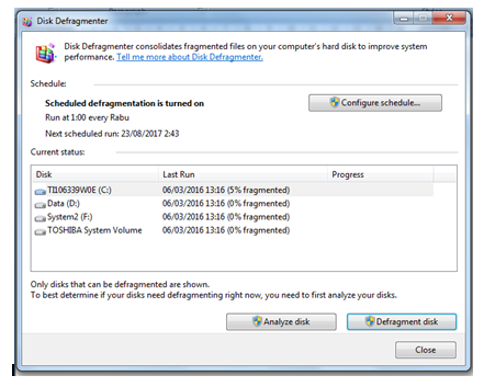 Sama halnya dengan Disk Cleanup, Disk Defragmenter juga merupakan bawaan dari windows. Berfungsi untuk mengatur kembali file-file dan folder agar lebih mudah diakses oleh sistem. Untuk hasil yang maksimal pertama-tama hapus software dan file-file yang tidak perlu, dilanjutkan dengan Disk Cleanup, kemudian ditutup dengan Disk Defragmenter.