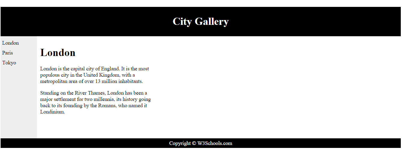 <div id="header"> <h1>City Gallery</h1> </div> <div id="nav"> London<br> Paris<br> Tokyo<br> </div> <div id="section"> <h1>London</h1> <p> London is the capital city of England. It is the most populous city in the United Kingdom, with a metropolitan area of over 13 million inhabitants. </p> <p> Standing on the River Thames, London has been a major settlement for two millennia, its history going back to its founding by the Romans, who named it Londinium. </p> </div> <div id="footer"> Copyright © W3Schools.com </div>