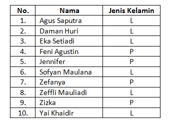 Pertanyaannya, berapa jumlah masing-masing nama orang yang berjenis kelamin laki-laki (L) dan berapa jumlah masing-masing nama orang yang berjenis kelamin Perempuan (P). Oleh karena kita tidak membahas mengenai studi kasus tabel buku, maka kita ubah pertanyaannya menjadi, “Berapa jumlah buku yang diterbitkan oleh penerbit Lokomedia dan PT Elex Media Komputindo?”.