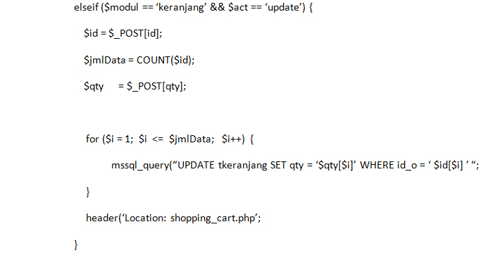 Kita dapat melakukan perubahan jumlah secara langsung pada belanjaan yang kita maksud, kemudian diakhiri dengan cara klik tombol update untuk melakukan perubahan quantity (qty). Proses aksi untuk update ini akan kita buat pada file aksi.php yang pernah kita buat, tambahan pada file tersebut dengan skrip berikut: