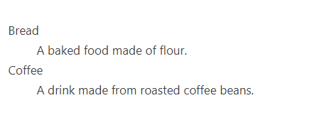 Definition List dibuat menggunakan tag <dl>. Tag <dl> digunakan bersama dengan <dt> – yang mendefinisikan item dalam daftar tersebut, dan <dd> menjelaskan item dalam daftar tersebut, berikut contoh kodenya:
